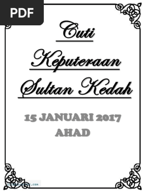 Listing the first sultan of kedah as sultan mudzafar shah i centuries before the partitioning of the abbasid caliphate into distinct sultanates and almost three centuries prior to the contradicting claims of the terengganu inscription stone. Merafak sembah tahniah sempena hari keputeraan duli yang amat mulia raja puan muda perak, tunku tan sri dato' seri diraja soraya. .negeri kedah, 2018 tarikh hari cuti 21 jan ahad hari keputeraan sultan kedah 16 feb jumaat tahun baru ahad hari keputeraan ydp agong 11 sep selasa awal muharram 16 sep ahad hari malaysia 6 nov by mohd fadli bakar. 0 ratings0% found this document useful (0 votes). Kebawah duli yang maha mulia sultan kedah darul aman.
