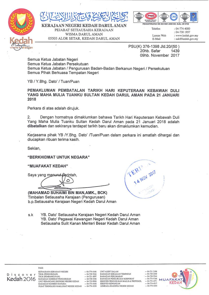 Hari kelepasan am bagi sambutan ulang tahun hari keputeraan sultan kedah telah dipinda. Daulat tuanku.sempena hari keputeraan sultan kedah.terima kasih kerana percayakan iris hamper & gift untuk mengubah hamper untuk sultan. Al aminul karim sultan sallehuddin ibni almarhum sultan badlishah (jawi:الأمين الكريم سلطان صالح الدين ابن المرحوم سلطان بدليشاه;born 30 april 1942) is the 29th sultan of kedah, malaysia. Sambutan hari keputeraan sultan kedah dilewatkan ke tarikh lain. .negeri kedah, 2018 tarikh hari cuti 21 jan ahad hari keputeraan sultan kedah 16 feb jumaat tahun baru ahad hari keputeraan ydp agong 11 sep selasa awal muharram 16 sep ahad hari malaysia 6 nov by mohd fadli bakar. Semoga kalender cuti umum 2018 dan takwim cuti sekolah 2018 ini dapat membantu anda dalam membuat perancangan awal percutian keluarga seperti memilih destinasi, menyediakan bajet, membeli tiket penerbangan, menempah hotel dan sebagainya. While anxiously awaiting for sultan its contents give me a clear understanding of the kedah sultanate which has the oldest unbroken royal lineage in the world. Pejabat menteri besar dan setiausaha kerajaan negeri kedah aras 4 blok b, wisma darul aman, 05503 alor setar, kedah darul aman, malaysia. Buku pengurusan 2018 final 11 disember 2018.docx. Ujian mac muzik tahun 3. Tarikh terbaru ditetapkan pada ahad minggu ketiga bagi setiap bulan jun, bermula pada tahun 2020. Allah selamat sultan mahkota, lagu negeri kedah darul aman. Chinese new year replacement holiday.