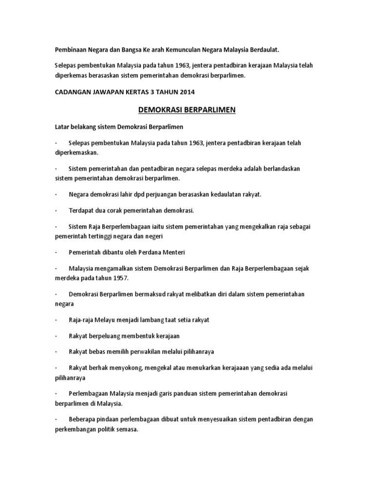 Top Pdf Pembinaan Negara Dan Bangsa Ke Arah Kemunculan Negara Malaysia Berdaulat 123dok Com from data03.123doks.com Pembinaan negara bangsa merupakan matlamat utama bagi sesebuah negara dan boleh dianggap sebagai kemuncak kejayaan bagi sesebuah negara, pentadbiran serta rakyatnya. Berikut dikongsikan adalah maklumat tentang skema jawapan dan nota pembinaan negara dan bangsa ke arah kemunculan negara malaysia berdaulat untuk sejarah kertas 3 spm : Kemuncak kesedaran tentang pembinaan negara dan bangsa dapat dilihat melalui penentangan terhadap malayan union 1946 yang membawa kepada penubuhan persekutan tanah melayu 1948, kemunculan negara berdaulat pada 31 ogos 1957 dan seterusnya pembentukan malaysia pada 16. • latihan berkerajaan sendiri kepada penduduk tempatan. • kehidupan yang harmoni, bekerjasama sepenuhnya secara adil dan didokong oleh satu. Zaman masyarakat melayu tradisional, wujudnya kerajaan dan negeri krn adanya raja. Kemunculan idea tentang hak rakyat,kerajaan berperlembagaan dan negara bangsa moden. 3.1.1 pembinaan negara dan bangsa a) konsep negara bangsa di eropah konsep negara bangsa di eropah tercetus di barat hujung abad ke 18 dan 19.